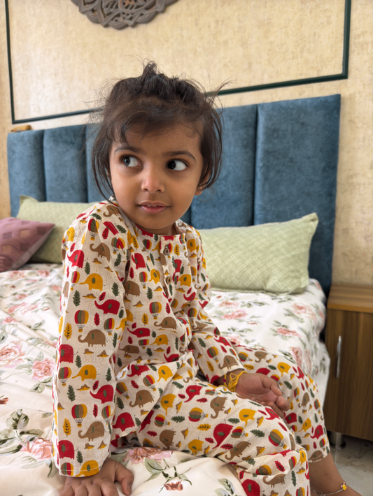 Dreamy Elephants Sleepwear - Kids pure cotton elephant printed night suit - Yellow